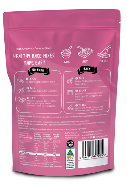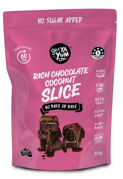 In need of a quick and easy mid-afternoon or late-night sweet treat with ZERO GUILT? Our "no-bake" Rich Chocolate Coconut Slice is so simple! Just add is 1-2 TBSP of melted butter or coconut oil or nut butter for a VEGAN option to our mixture. Either roll into balls, press into silicone moulds of any shape and refrigerate or freeze for approx 5 minutes all depending on how firm you would like them. This mixture makes the perfect base for mini cheesecakes, protein balls, trail mix, chocolate truffles, makes great ice cream sandwiches , or even baked to make rich brownies - So many variations! Check out our Instagram page for more inspiration and recipe ideas @getyayumon creations and recipes! Makes approx 4 squares in a square silicon mould tray or 4-8 med to large sized balls